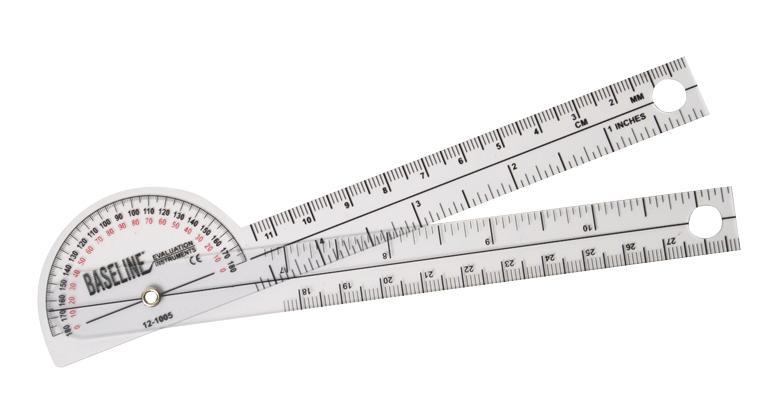 Caurspīdīgs, kompakts Baseline goniometrs ar 180° mērījumu skalu locītavu kustīguma noteikšanai. Uz tā ir 5 collu lineārā skala, kas kalibrēta gan collās, gan centimetros. Viegls un ērti pārnēsājams, pateicoties izmēram, to var ievietot arī krūšu kabatā.