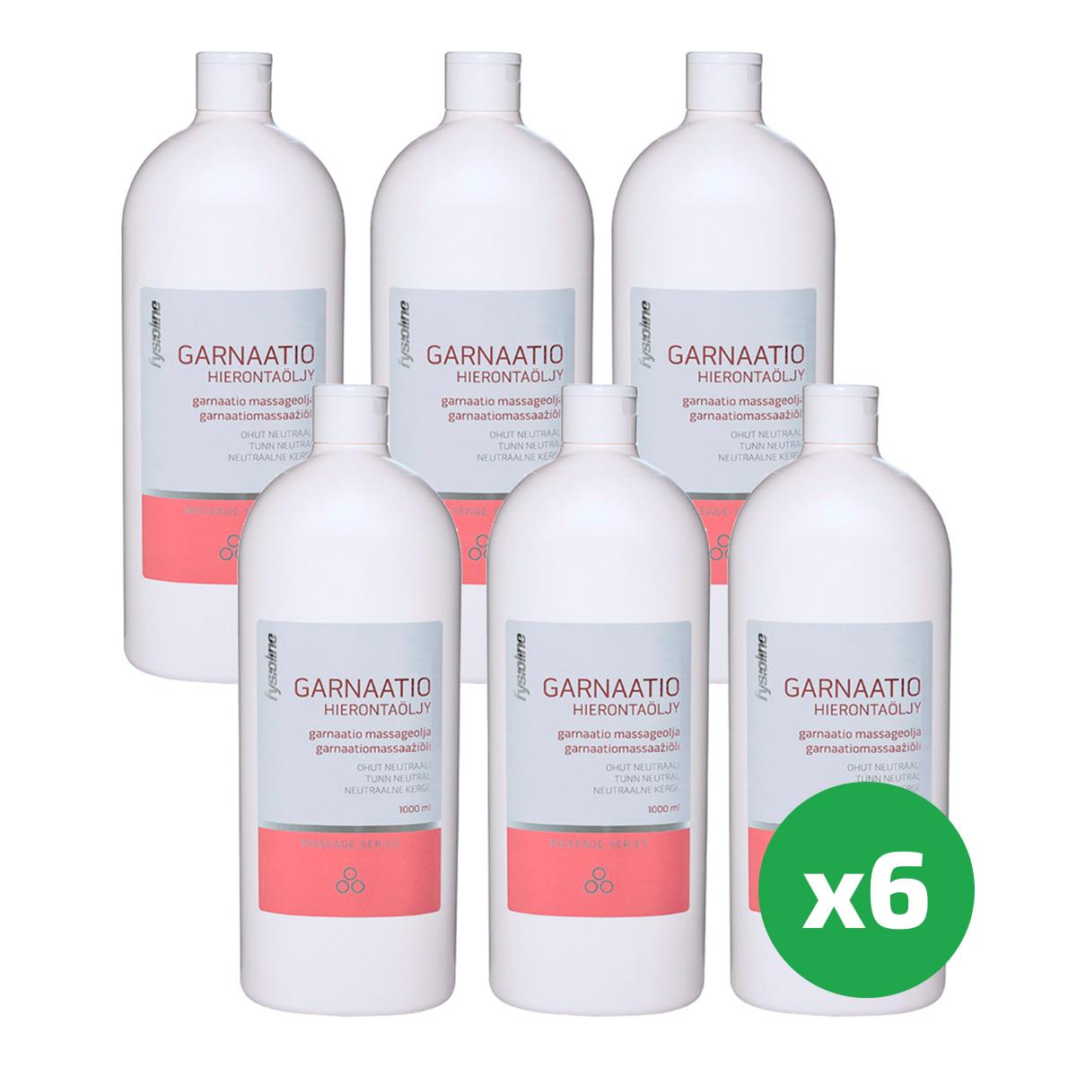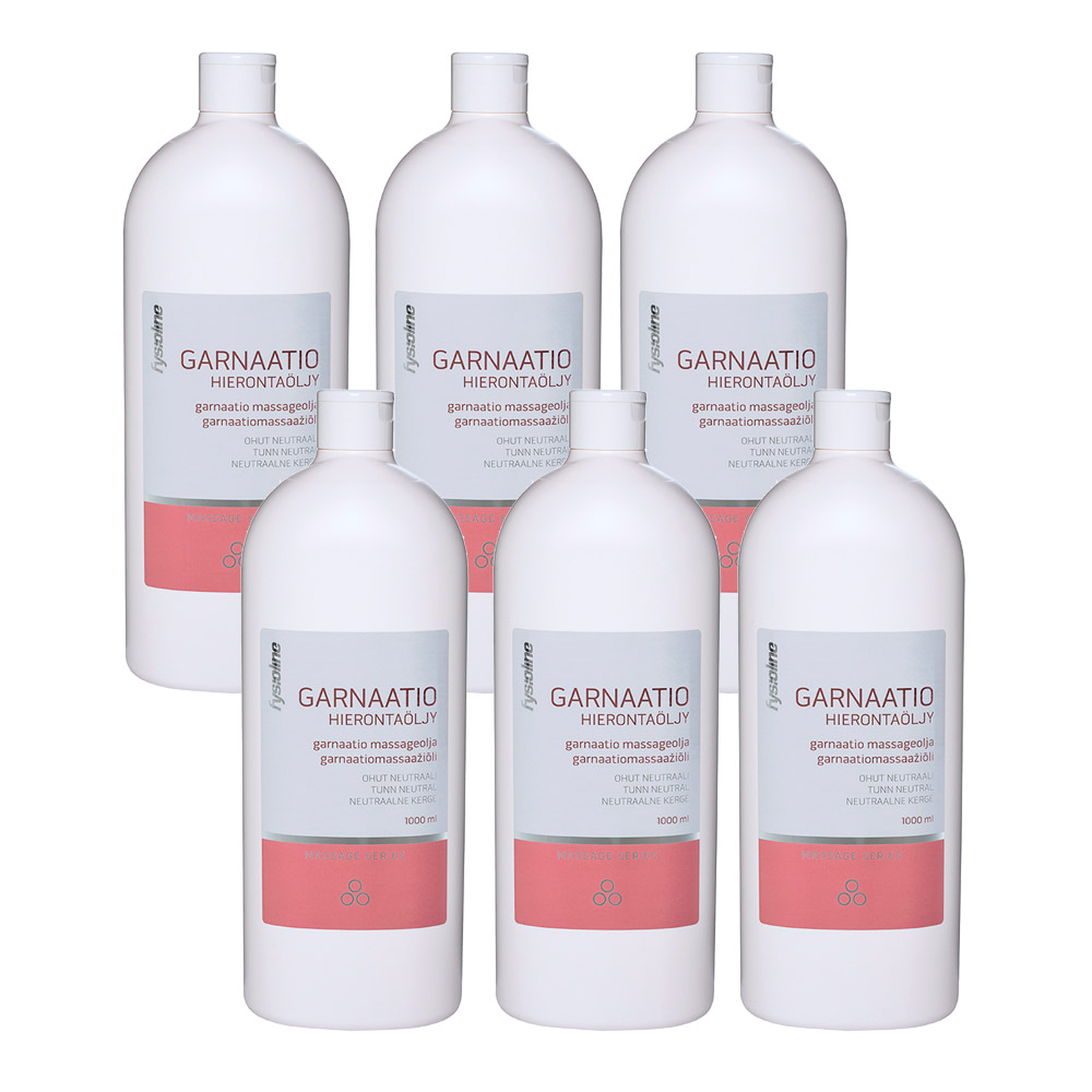 Fysioline Garnaatio masāžas eļļa ir neitrāla, smalkas struktūras bāzes eļļa ar vieglu, plānu konsistenci. Tā ir viegli notīrāma no ādas un piemērota profesionālai lietošanai. Ražota Somijā. 6 pudeļu komplekts (1L × 6).