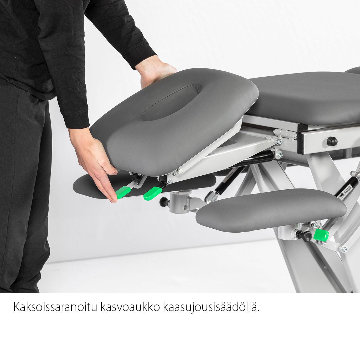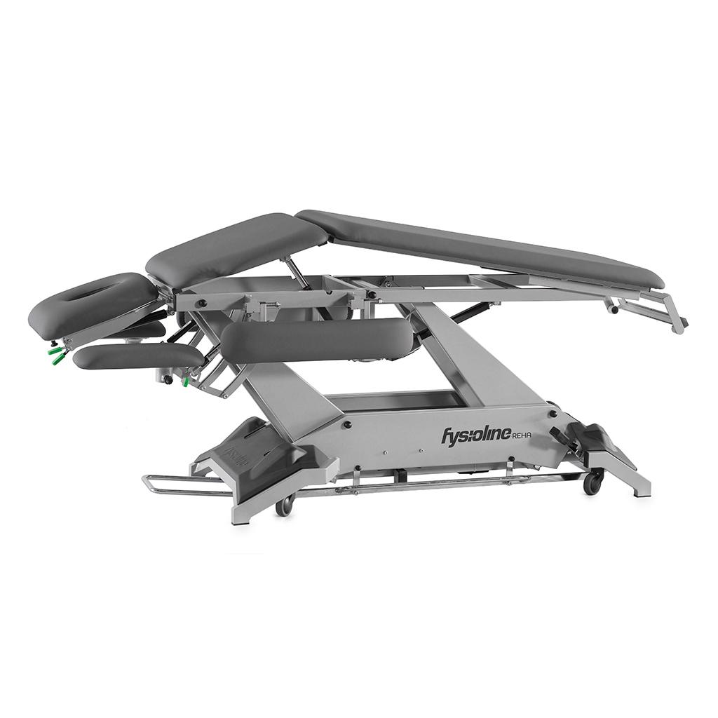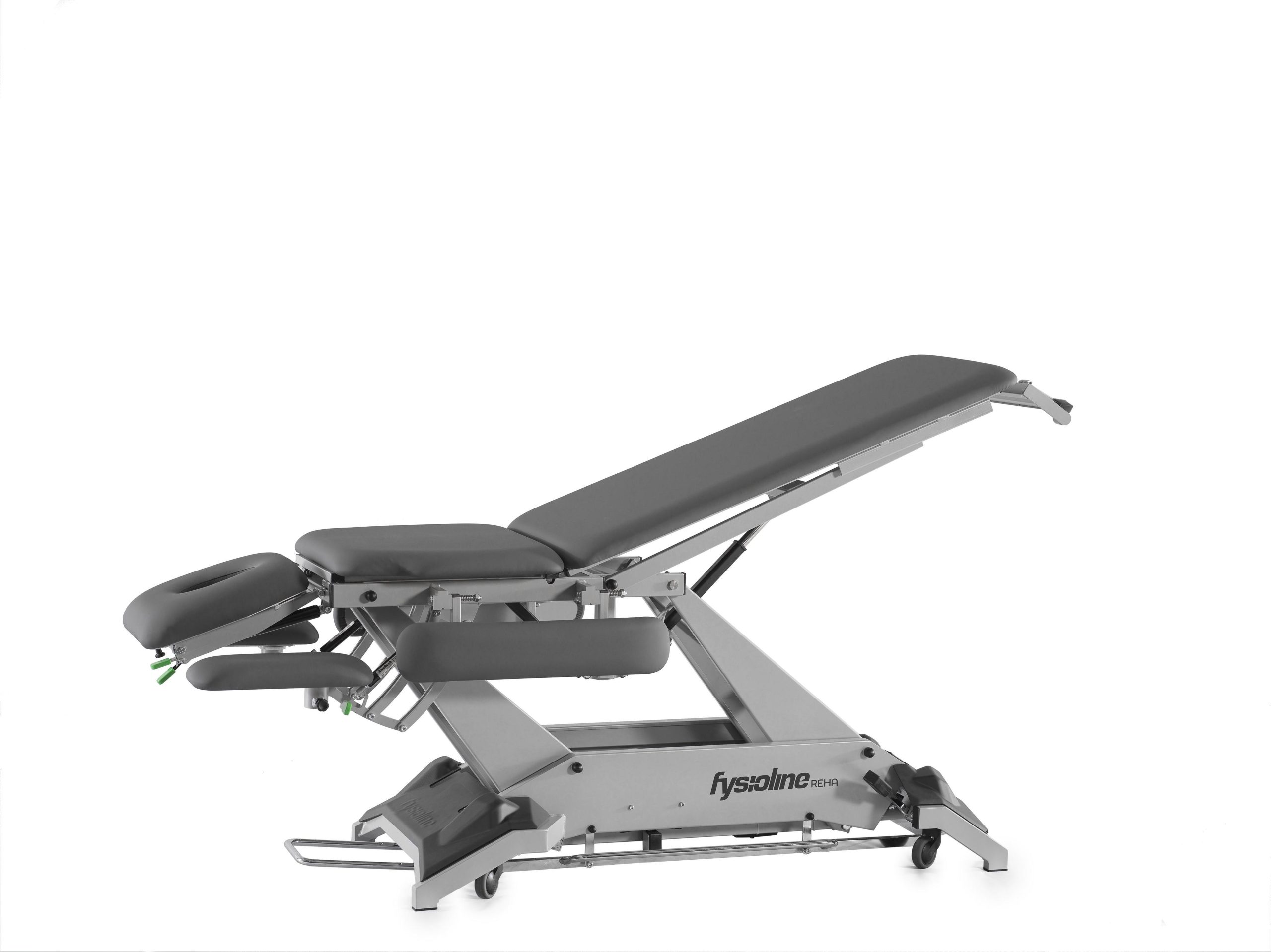 Fysioline REHA 950 ir procedūru galds ar 7 daļām, kas papildus standarta funkcijām aprīkots ar motorizētu krūšu un kāju daļas regulēšanu. Tas ir izstrādāts profesionālai lietošanai, nodrošinot precīzu ergonomiku un ērtu pielāgošanos dažādiem ārstniecības un rehabilitācijas procesiem.