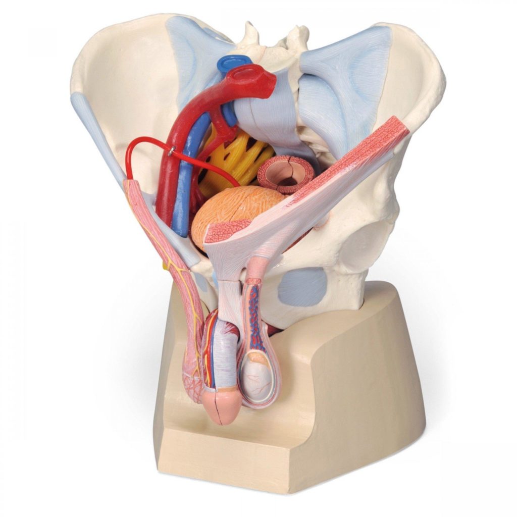 Augstas kvalitātes anatomiskais modelis, kas precīzi attēlo, kā vīrieša iegurņa rajonā savstarpēji saistīti kauli, saites, asinsvadi, nervi, iegurņa pamatnes muskuļi un ārējie dzimumorgāni.