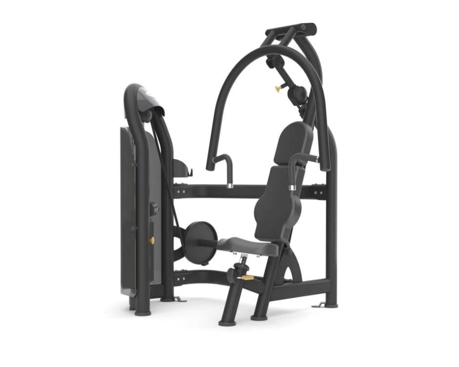 Krūšu spiešanas trenažieris ar integrētu svaru sistēmu paredzēts krūšu muskuļu trenēšanai, vienlaikus aktivizējot plecus un tricepsus. Platie rokturi nodrošina komfortu un dažādas satvēriena variācijas, savukārt regulējams sēdeklis un sviras ļauj pielāgot kustību amplitūdu individuālām vajadzībām.