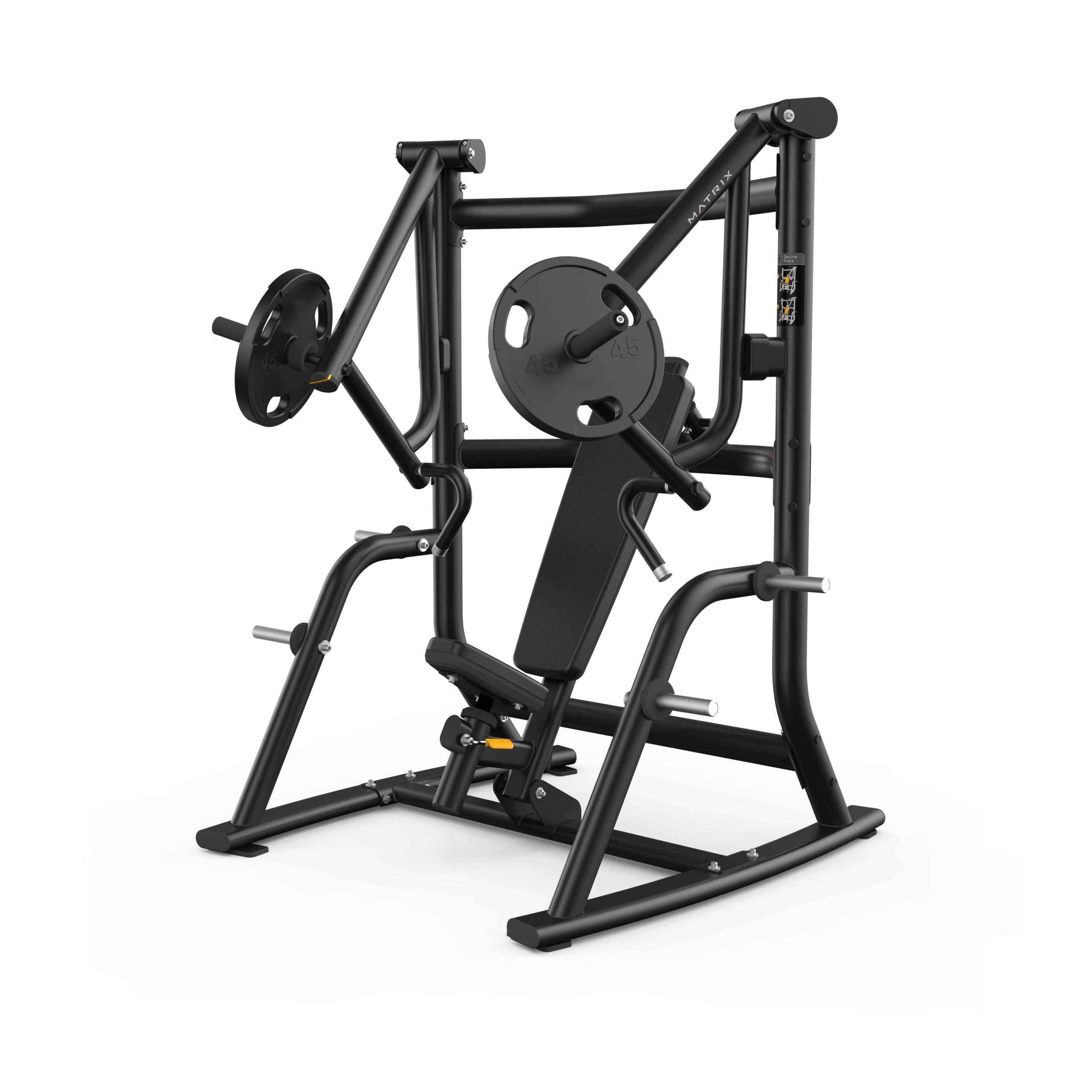 Matrix Magnum krūšu spiešanas trenažieris slīpi uz leju (Decline Press) ar brīvo svaru uzlādi ir paredzēts profesionālai lietošanai sporta zālēs un treniņu stacijās. Tas nodrošina efektīvu krūšu muskuļu apakšējās daļas, plecu un tricepsu trenēšanu, saglabājot dabisku kustību trajektoriju un drošu vingrinājuma izpildi.