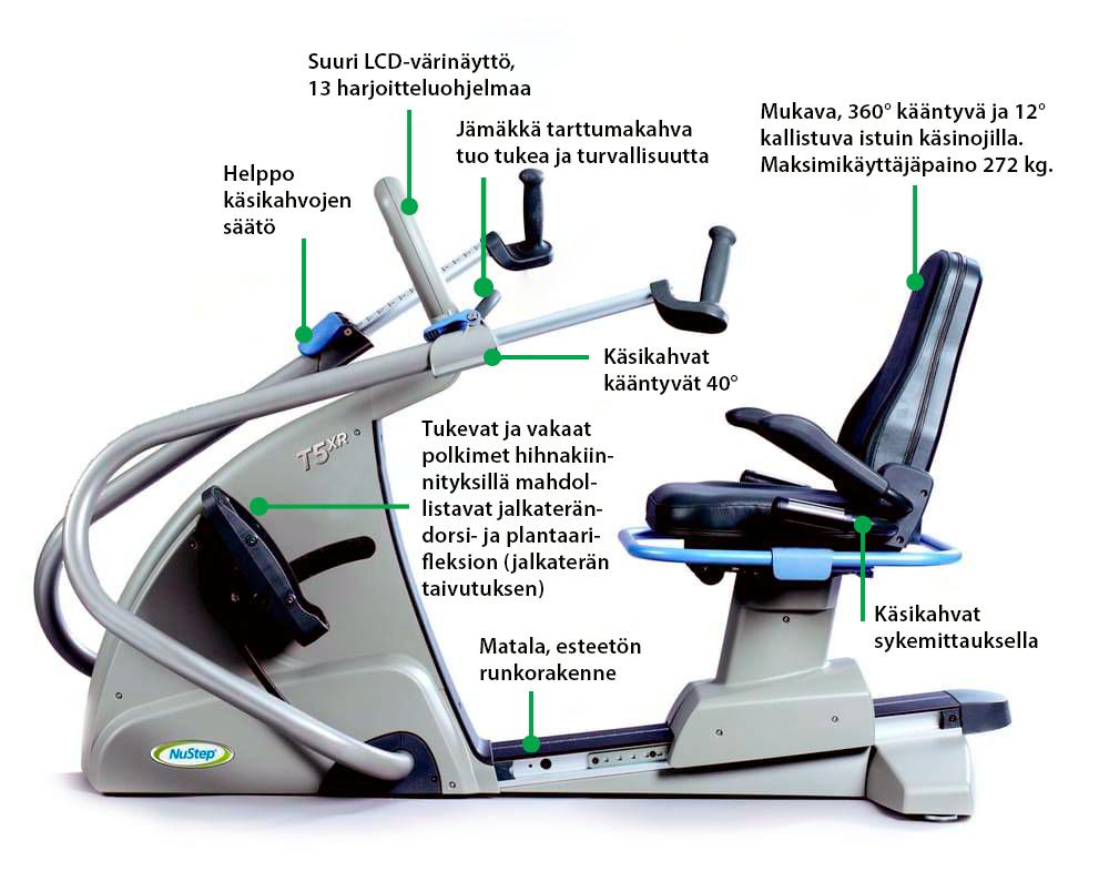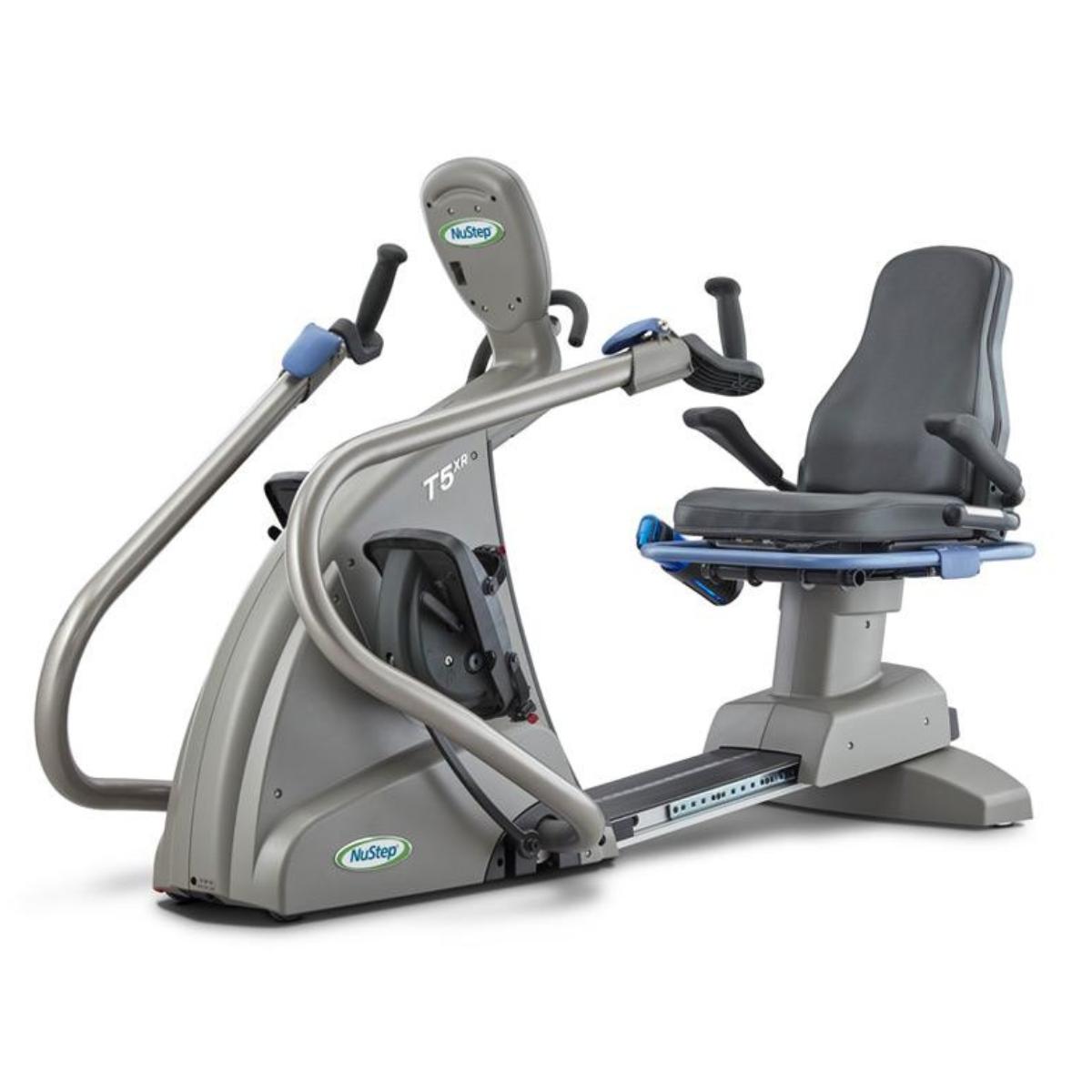 NuStep T5XR ir sēžamais eliptiskais trenažieris, kas paredzēts rehabilitācijai, fizioterapijai un ikdienas fiziskajām aktivitātēm. Pateicoties dabiskajai kustību trajektorijai un sinhronizētai roku un kāju kustībai, tas nodrošina vienmērīgu, locītavām saudzīgu treniņu. Atvērtais rāmja dizains ļauj ērti piekļūt sēdeklim, padarot ierīci īpaši piemērotu arī lietotājiem ar kustību traucējumiem.