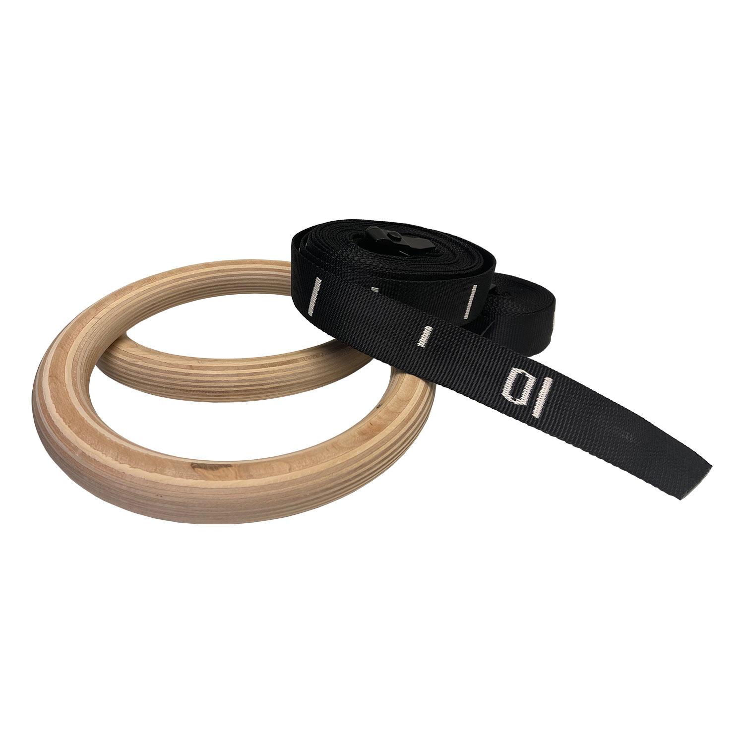 Komplektā ietilpst divi augstas kvalitātes bērza koka gredzeni ar regulējamām siksnām, kas aprīkotas ar garuma atzīmēm un tērauda stiprinājumiem. Gredzenus var viegli piekarināt pie stieņa, bet griestu stiprinājumiem nepieciešamie piederumi jāizvēlas atbilstoši griestu materiālam (nav iekļauti komplektā).